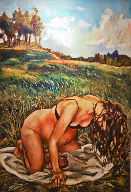 Greavette’s statement:  I’m interested in how women navigate the dramatic process of childbearing and how it shapes and changes their identity. I aim to create work that is provocative, beautiful and heavy with emotion and symbol. The paintings represent an intensely personal but simultaneously universal and ageless experience. Much beauty and drama is lived through a woman’s body, in ways that can be both empowering and debilitating. The pieces I make have a narrative that unfolds according to the viewers’ own experiences, but also represent aspects of the larger story of women’s history. I hope women can see their own stories mimicked in the paintings, as well as emotions, beliefs and experiences they may not be able to express or fully explain.