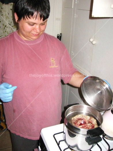 She then took the placenta and placed it in a double broiler to steam (she provided everything; none of my own pots and pans, bowls or knives were used). Surprisingly enough, there was not an odor while cooking. In fact, I couldn’t smell anything other than the herbs she added to the placenta.