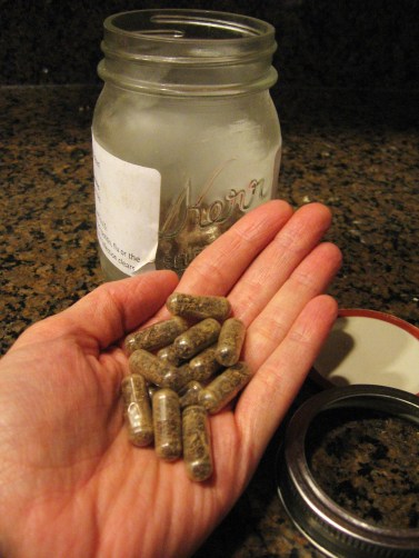 When Placenta Lady arrived the next day, she ground up the placenta, amniotic sac (but not the cord, that was a keepsake) into a loose powder, placed the powder into capsules (my placenta gave me 168 capsules), and placed the capsules into a charming glass mason jar. Placenta Lady gave me detailed instructions on how and when to take my placenta pills, what its uses and benefits were, and what to expect from them. She also provided me with a list of local resources for postpartum depression.