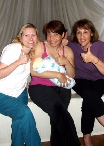 The tub helped immensely. I am so glad and grateful that I had the option of laboring and birthing in the water. I do remember that for the very brief time I was in the water that I did have a few moments in between contractions where I could rest. In fact, I remember my co-worker and friend ( fellow birth assistant that was assisting with my birth) was taking pictures. She snaps one of Jean, the midwife, and Lynne, the co-owner of the birth center, where they give big smiles and thumbs up, I happened to look up from the tub at that moment and I decided it would be funny to photo bomb the pic (since I was in the background) and I gave a big huge smile and thumbs up with them- I was 8 or 9 cms at that point. I guess I’m just trying to prove the point of when you’re not contracting, you’re pretty normal…and so those breaks are nice. I’m glad once I got in the tub, I had a couple.