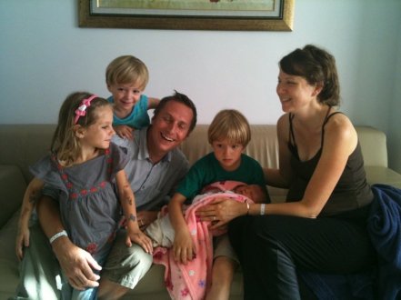 I met Valerie while I was touring Europe with a band the summer of 2oo2. She sat across from me at a dinner party and spoke her perfect English with her ever so charming Swiss French accent. She was so sweet and quirky and funny – I just couldn’t help myself, I loved her. As fate would have it, Valerie and I became the best of friends. In 2003, Valerie met and married her husband, Youval, where they settled outside of his home town of Tel Aviv, Israel. In June of 2011, Valerie gave birth to her second daughter and her fourth baby. It was a successful VBAC. I asked Valerie to share her story with us and she’s done a great job telling us about her birth. Keep in mind as you read this that English is just one of the four languages Valerie speaks. I’m seriously impressed by this mama (and proud of my friend) and I think you will be too. You’ll read about how she found a new care provider at 42 weeks in her pregnancy who supporter her birth choices, she labored in a birth pool, she pushed for FOUR HOURS and gave birth to a 10-pound-baby. Amazing! Enjoy ~