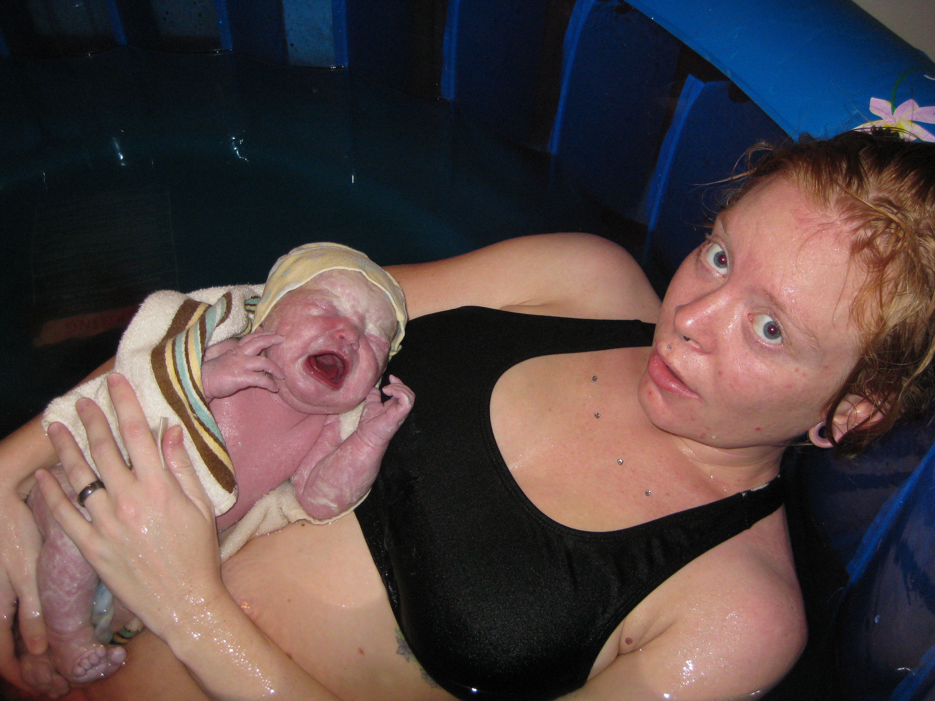 I woke up in the early morning with constant horrible back pain that nothing helped. After a while the pain broke up into contractions & I called the midwife. I woke my husband & labored in the tub & on the birthing ball. I threw up several times. The midwife Susan arrived & started setting up. She had me take a tablespoon of honey to stop the vomiting, it worked for a while but I gagged it down because I hate honey. Our 2-year-old woke up & my husband got her dressed, fed, & occupied in her bedroom. Susan’s assistant arrived & Susan checked me, 8 cm – hopefully enough time to set up the birthing pool. After the 3 of them fiddling with faucets they finally got it set up & filled. Our first daughter checked it out but then returned to her room. I climbed in & my husband applied counter pressure for my back labor (another posterior babe) & Shonda (the assistant) applied a cool cloth to my head. My legs & hips also hurt with the contractions, I labored in the pool on hands & knees during contractions with counter pressure, sitting on my knees breathing & relaxing in between them. Every once in a while I would hang over the tub & throw up into a bowl. During a contraction my water burst & I announced it. Babe had spun from posterior to LOA right around then. Susan checked me & said I had a bit of a cervical lip but she could push it back when I was ready to push, I was ready so we did. 1 minute after my water broke & 4 pushes & she was out into my hands, no ring of fire & no tearing. 11:41am, a bit over 4 hours of labor. Our first daughter came to meet her new sister but was still uninterested. Our new babe had a really short cord so she rested on my belly until we were ready to get out of the tub & birth the placenta on the birthing stool while I nursed her.