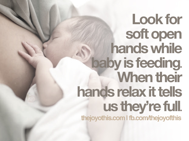When newborns are hungry, their hands are fisted and drawn tight against their chest. However, during a feeding and once their tummies begin to fill up, their hands open, their fingers soften, and their arms lie lower across their body.